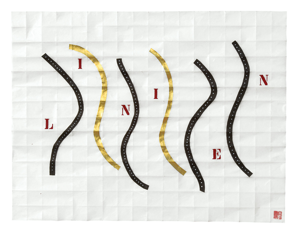 Lore BertLinien, 2008Falt-Feld-Collage mit Schrift und Blattgold auf Japanpapier50 x 60 cmWVZ-Nr. 08075