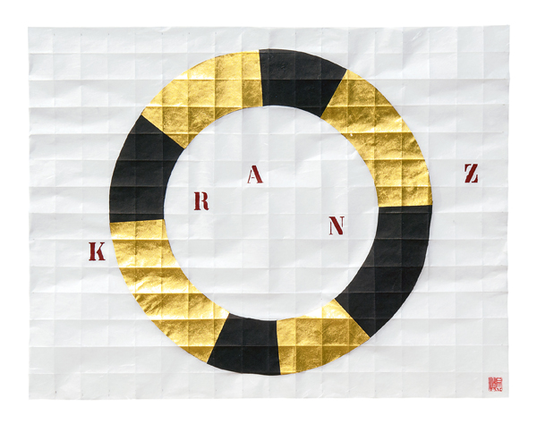 Lore BertKranz, 2008Falt-Feld-Collage mit Schrift und Blattgold auf Japanpapier50 x 60 cmWVZ-Nr. 08071