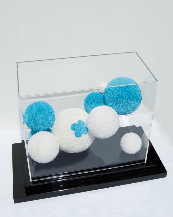 Lore BertBunte Kugeln (türkis weiss), 2014Objekt mit 9 Papier-Kugeln und schwarzem Lacksockel42 x 56 x 28 cmWVZ-Nr. 14122