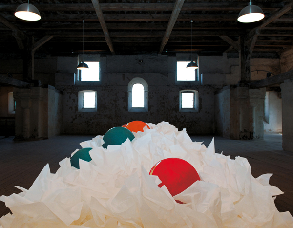 Environment: Installation mit 9 farbigen Kugeln und Papier