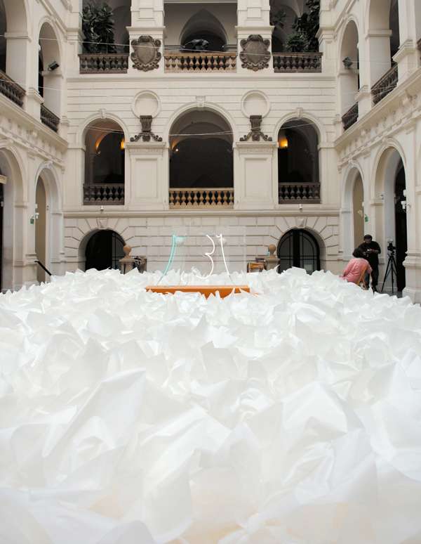 Lore Bert Station 246, 2006 Environment: Installation mit Neon-Skulptur Zahl 246 und Papier in Wroclaw · Muzeum Narodowe (National Museum) 700 x 1100 cm WVZ-Nr. 06211