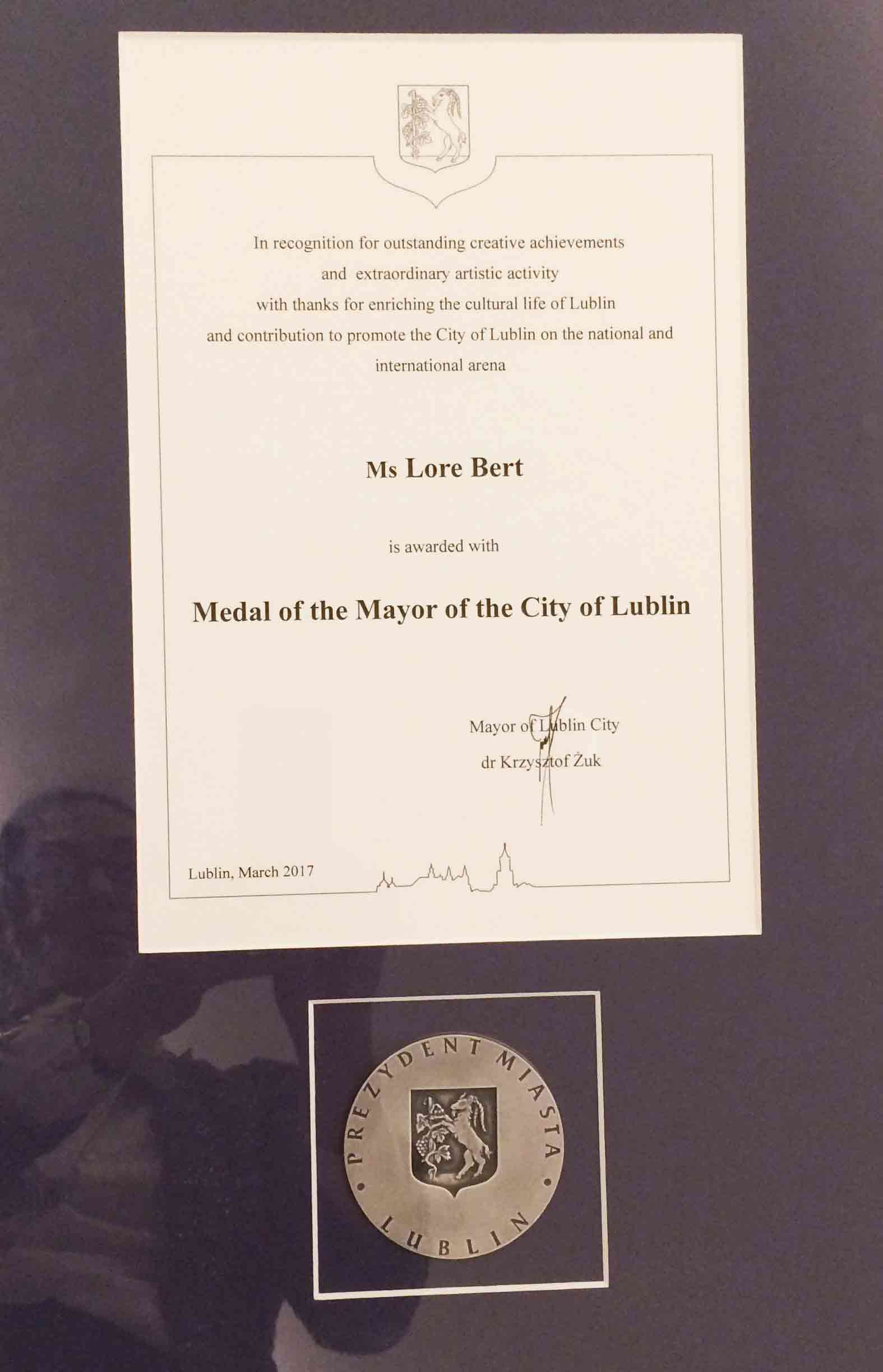 Im Folgenden finden Sie einige Eindrücke der äußerst gelungenen Vernissage, während derer Lore Bert mit der Verleihung der Medaille der Stadt Lublin für ihre herausragenden Verdienste um das kulturelle Leben der Stadt geehrt wird. Lore Bert was awarded the Medal of the City of Lublin in recognition of her services in advancement of the city’s cultural life. |