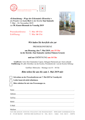 Unter dem Titel »Illuminazione (Erleuchtung) – Wege der Erkenntnis (Heureka)« zeigt die Künstlerin in der Kirche San Samuele vom 7. Mai bis zum 24. November 2019 ein raumgreifendes Environment aus Papier und dichroitischem Glas. Das außerordentliche Projekt wurde realisiert in Zusammenarbeit mit der ›Diocesi Patriarcato di Venezia – Ufficio Beni Culturali‹ und wird maßgeblich gefördert von der ›van der Koelen Stiftung für Kunst und Wissenschaft‹.