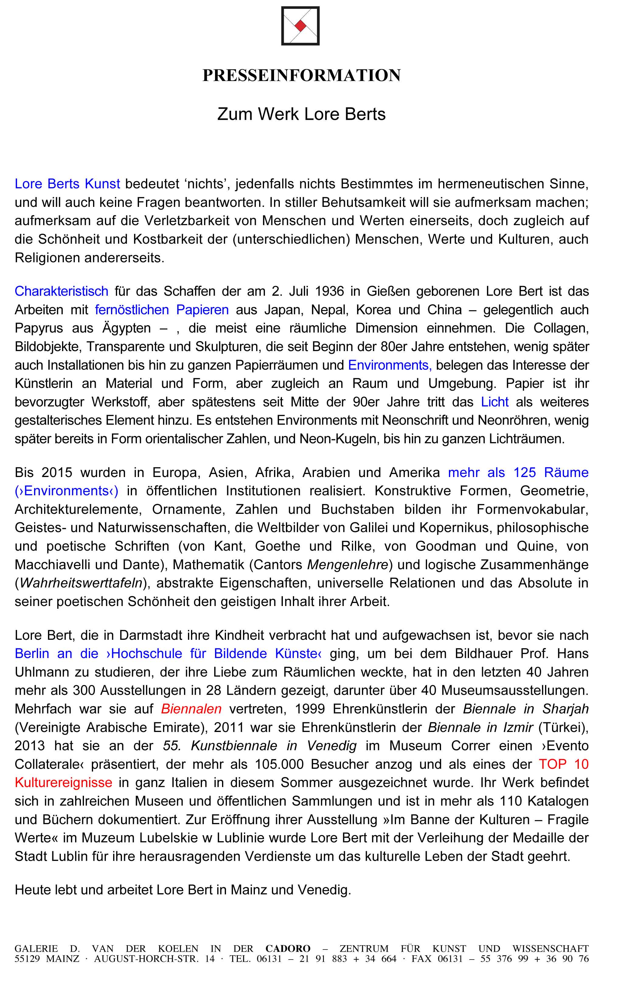 Lore BertLore Bert, geboren am 2. Juli 1936 in Giessen, aufgewachsen in Darmstadt, studierte 1953–57 Malerei in Berlin an der HfBK, Hochschule für Bildende Künste bei dem Bildhauer Hans Uhlmann, der ihre Liebe zum Räumlichen weckte. Charakteristisch für ihr künstlerisches Schaffen seit mehr als vier Jahrzehnten ist das Arbeiten mit fernöstlichen Papieren aus Japan, Nepal, Korea und China, die oft eine räumliche Dimension einnehmen. Die Collagen, Bildobjekte, Transparente und Skulpturen, die seit Beginn der 80er Jahre entstehen, wenig später auch Installationen bis hin zu ganzen Papierräumen und Environments, belegen das Interesse der Künstlerin an Material und Form, aber zugleich an Raum und Umgebung. Papier ist ihr bevorzugter Werkstoff. Mit ihren Ausstellungen 1996 in Kairo (Ägypten) kommen weitere Materialien wie der bräunlich farbene Papyrus und das hell leuchtende 23 Karat Blattgold zu ihrem Farben- und Material-Kanon hinzu. Spätestens seit Mitte der 90er Jahre gehört auch das Licht zu ihren Gestaltungselementen. Es entstehen Environments mit Neonschrift und Neonröhren, wenig später bereits in Form orientalischer Zahlen und Neon-Kugeln, bis hin zu ganzen Licht-Räumen. Konstruktive Formen, Geometrie, Architekturelemente, Ornamente, Zahlen und Buchstaben bilden ihr Formenvokabular, Geistes- und Naturwissenschaften, die Weltbilder von Galilei und Kopernikus, philosophische und poetische Schriften (von Kant, Goethe und Rilke, von Goodman und Quine, von Macchiavelli und Dante), Mathemathik (Cantors Mengenlehre) und logische Zusammenhänge (›Wahrheitswerttafeln‹), abstrakte Eigenschaften, universelle Relationen und das Absolute in seiner poetischen Schönheit den geistigen Inhalt ihrer Arbeit. Historische Zusammenhänge oder kulturelle Besonderheiten anderer Länder, die sie aufgrund ihrer Ausstellungen kennen lernt, halten Einzug in ihr Werk, werden bildnerisch formuliert und prägen den globalen Aspekt ihrer Arbeit. Ab 1985 beginnt mit einer Ausstellung in Montreal (Kanada) eine rege internationale Ausstellungstätigkeit, die sich schnell global ausbreitet und Lore Bert schon 1989 nach Korea führt. Mehr als 300 Ausstellungen in 29 Ländern sind dokumentiert in gut 120 Publikationen, davon mehr als 50 Monographien zu Einzelausstellungen in Museen. In vielen dieser Ausstellungen konnte Lore Bert speziell dafür konzipierte Environments realisieren. Bis 2024 wurden in Europa, Asien, Afrika, Arabien, in den USA, im Vorderen Orient und in Mexiko in Museen und öffentlichen Ausstellungsinstituten mehr als 130 Kunst-Räume realisiert. Oft war die Basis ein ‘Meer’ aus gefalteten Papieren, kombiniert mit verschiedenen Materialien: mit Licht, mit beschrifteten Kugeln, mit Spiegelskulpturen in Form der ›Platonischen Körper‹ wie auf der Biennale in Venedig 2013 oder im National Museum Busan 2014 oder – wie bei der Biennale 2019 in Venedig – mit Stelen aus dichroitischem Glas. Mehrfach war Lore Bert auf Biennalen vertreten, 1999 als Ehrenkünstlerin der Biennale in Sharjah (Vereinigte Arabische Emirate), 2011 als Ehrenkünstlerin der Biennale in Izmir (Türkei), und 2013 hat sie an der 55. Kunstbiennale in Venedig im Museum Correr einen ›Evento Collaterale‹ präsentiert, der mehr als 105.000 Besucher anzog und als eines der TOP 10 Kulturereignisse in ganz Italien in diesem Sommer ausgezeichnet wurde. Parallel zur Kunstbiennale in Venedig 2019 zeigte die Künstlerin ihre atemberaubende Installation Illumination – Ways to Eureka in der Kirche San Samuele in Venedig. Zwei Säulen aus dichroitischem Glas ragen aus einem weiß-wogenden Papiermeer und laden den Betrachter immer wieder neu zum Schauen und Staunen ein. Zur Eröffnung ihrer Ausstellung Im Banne der Kulturen – Fragile Werte im Muzeum Lubelskie w Lublinie (Polen, 2016) wurde Lore Bert mit der Verleihung der ›Medaille der Stadt Lublin‹ für ihre herausragenden kreativen Leistungen und ihre Verdienste um das Kulturelle Leben der Stadt geehrt. Im Jahr 2021 und anlässlich des 85. Geburtstages Lore Berts zeigen Ausstellungshäuser in aller Welt (u.a. St. Louis/USA, Felanitx/Spanien) Ausstellungen mit klassischen und neuen Arbeiten der fleißigen Mainzerin. Das Gutenberg-Museum in Mainz zeigte ebenfalls eine große Schau unter dem Titel Ways of World Making und der Oberbürgermeister der Stadt Mainz ehrte die Künstlerin darüber hinaus mit dem ›Mainzer Teller‹ für ihr unermüdliches kreatives Schaffen. Im Dezember 2021 wird Lore Bert zusätzlich mit dem bedeutenden ›Signs Award‹ in der Kategorie Kunst ausgezeichnet, dem »Oscar der Kommunikationsbranche« (ntv). »Hier werden die Impulsgeber des Jahres gekürt.« (Handelsblatt), die Social Leader, die Vorbilder der Gesellschaft, die Zeichen setzen. Lore Bert lebt und arbeitet in Mainz und Venedig. |