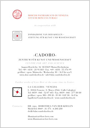 Nel 2013 la mostra di Lore Bert ›Art & Knowledge‹, evento collaterale della Biennale di Venezia, fu festeggiata da un pubblico entusiasta. Oggi, nel 2019, l’artista realizza una nuova, strepitosa installazione nella città lagunare: un environment di grandi dimensioni fatto di carta e vetro dicroico dal titolo »Illuminazione« – Vie verso la percezione (Eureka) nella Chiesa di San Samuele (7 maggio – 24 novembre 2019). Il progetto è sostenuto principalmente dalla ›Fondazione van der Koelen per l’Arte e per la Scienza‹ in cooperazione con la ›Diocesi Patriarcato di Venezia - Ufficio Beni culturali‹.