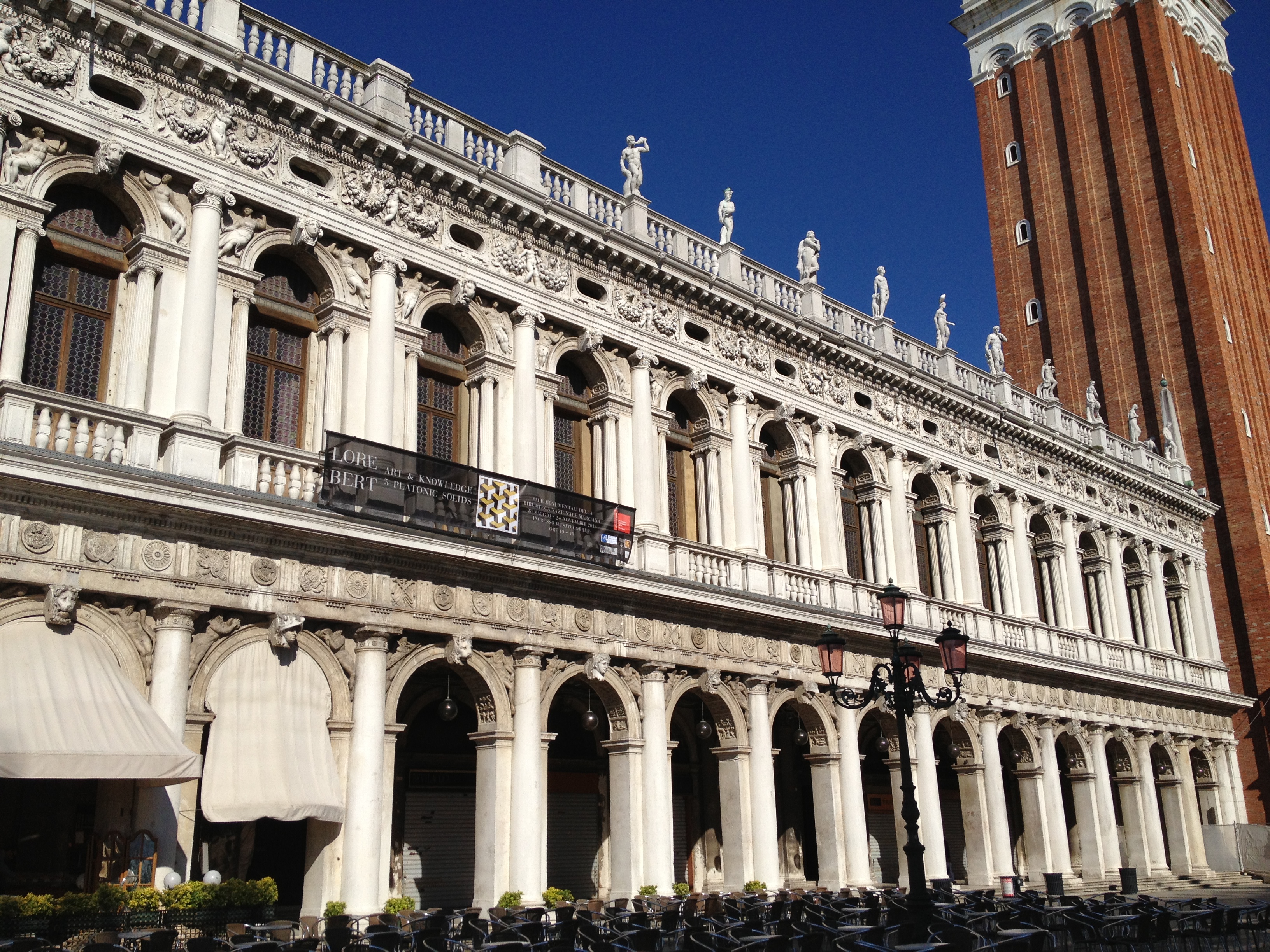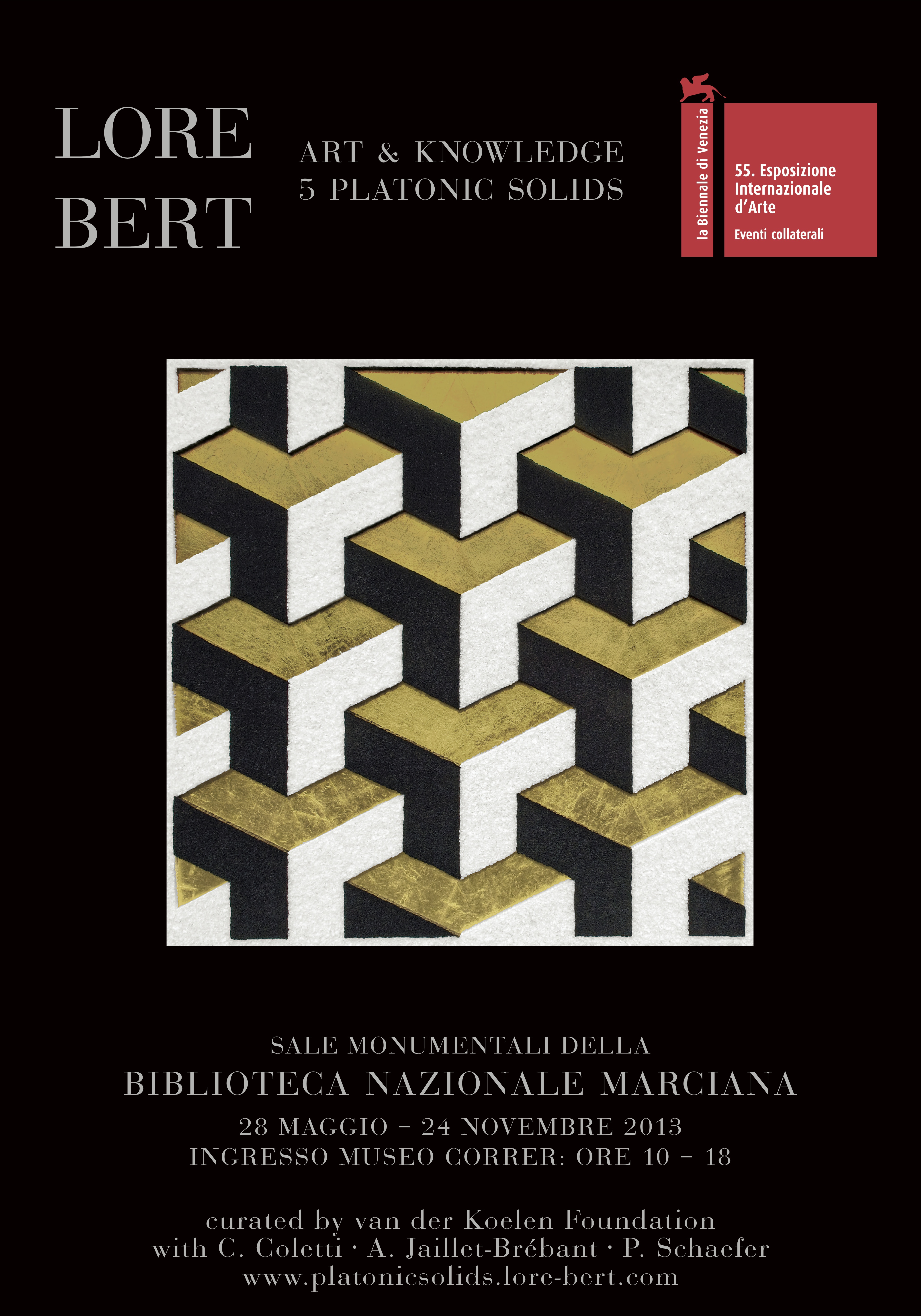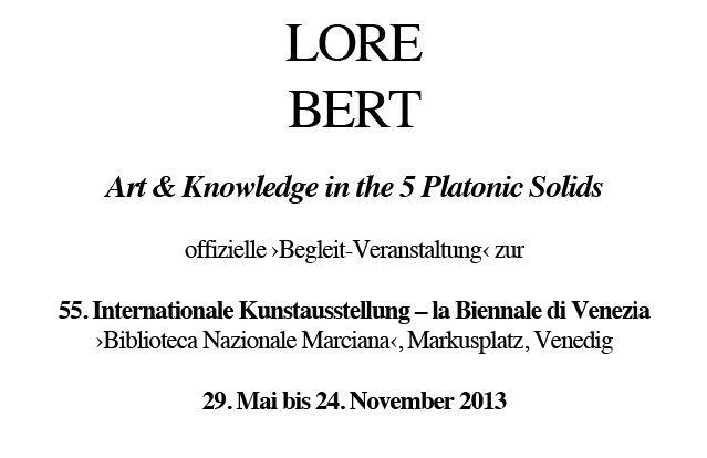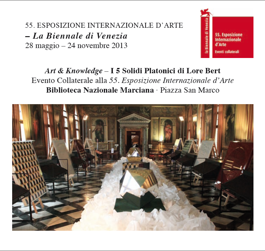 Vom 29. Mai bis zum 24. November 2013 findet in den Sale Monumentali der Biblioteca Nazionale Marciana die ›Collateral-Ausstellung‹ der deutschen Künstlerin LORE BERT "Art & Knowledge in the 5 Platonic Solids" statt. Kuratiert wird sie von Alice Jaillet-Brébant, Cristiana Coletti und Petra Schaefer mit Unterstützung der ›van der Koelen Stiftung für Kunst und Wissenschaft‹ in Zusammenarbeit mit der ›Biblioteca Nazionale Marciana‹. Ausgestellt werden das großformatige Environment 5 Platonic Solids – 5 verspiegelte Skulpturen, die in ein Meer von gefaltetem Papier integriert sind – und 12 Bildobjekte je 180 x 180 cm. Maurizio Messina, Direktor der ›Biblioteca Nazionale Marciana‹ (Markusbibliothek), Dorothea van der Koelen, Präsidentin der ›van der Koelen Stiftung für Kunst und Wissenschaft‹ und Bettina Gräfin von Pfeil, 3sat-Kulturredakteurin eröffnen die Ausstellung.